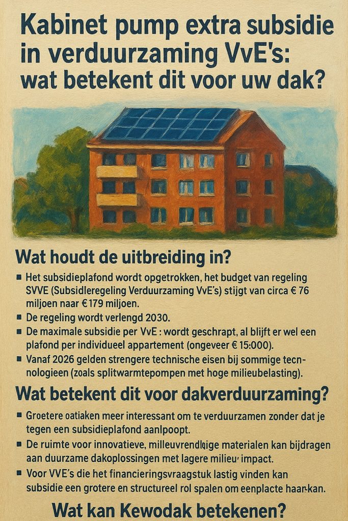 Het kabinet zet een belangrijke stap richting verduurzaming van appartementencomplexen. Er komt een forse uitbreiding van de subsidie voor Verenigingen van Eigenaars (VvE’s) — ook op dakgebied — waarmee het aantrekkelijker wordt om duurzame maatregelen door te voeren. Wat houdt de uitbreiding in? Het subsidieplafond wordt opgetrokken: het budget van de regeling SVVE (Subsidieregeling Verduurzaming […]